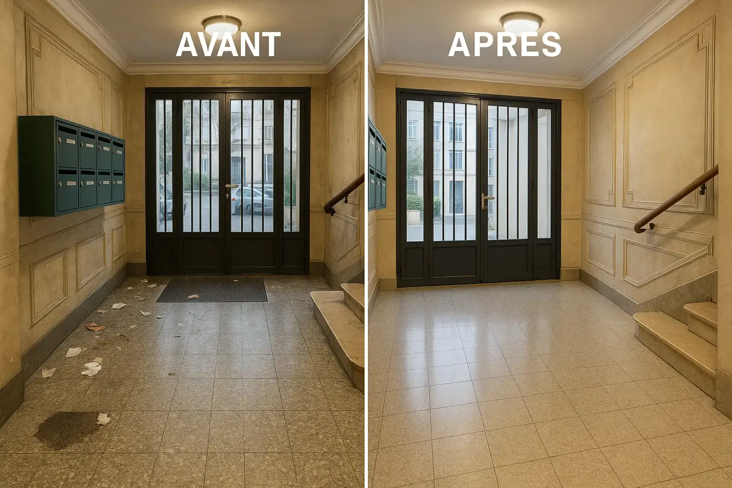 Hall d'entrée, couloirs, escaliers, sols, poignées, ascenseurs, points de contact, parkings, tapis, moquettes miroirs...
