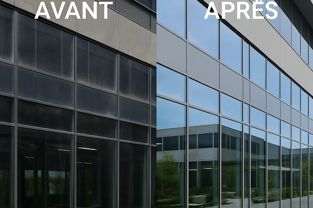 Nettoyage régulier ou ponctuel des surfaces vitrées du bâtiment, intérieures et extérieures, et même en hauteur.